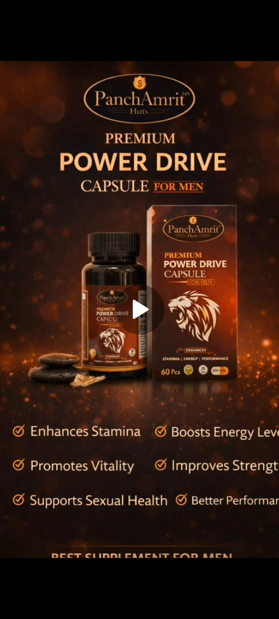 PanchAmrit Premium Power Drive Capsule for Men is a potent Ayurvedic formulation designed to enhance stamina, energy, vitality, and overall performance. Enriched with 21 powerful natural herbs and extracts, this supplement helps combat fatigue, boost physical endurance, and support active lifestyle needs—100% organic, chemical-free, and steroid-free.